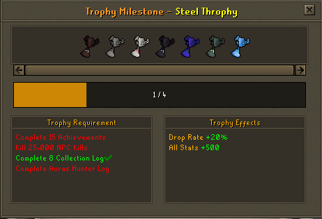 - Steel Trophy: Complete 15 achievements, 25K total KC, 8 collection logs, Complete Aura hunter Log